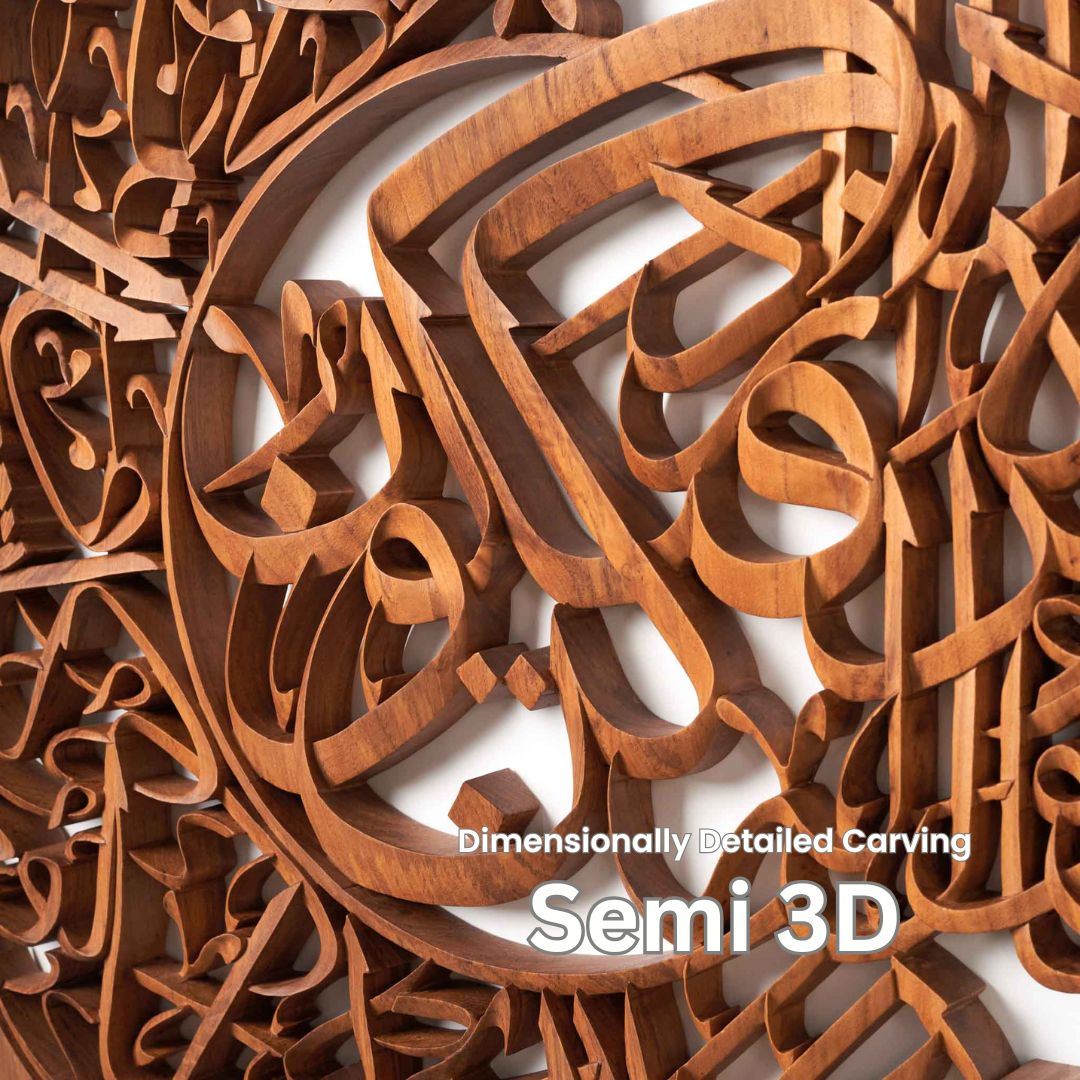 The Full 3D calligraphic carving style is characterized by narrow or thinner letters. Individual letters are more intricate and overlap at varying sectional gradients to form verses. This hand-carving style requires a high level of skill and is time-consuming to produce.