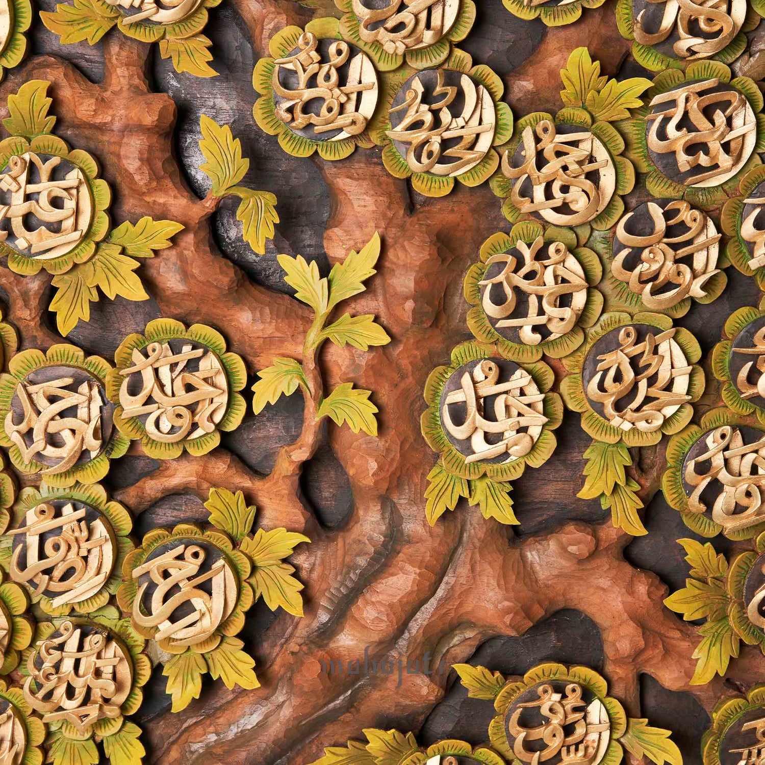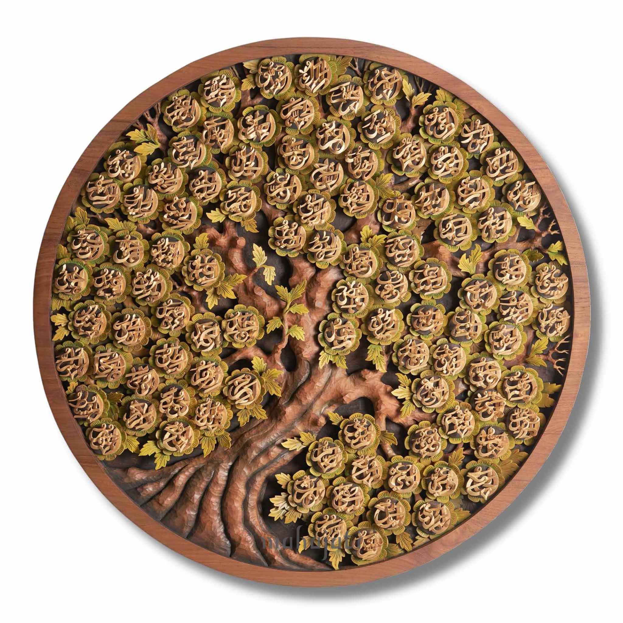 Measuring 120cm (length) and 8cm (thick), the hand-carved 3 dimensional wood art of this Asmaul Husna - Olive Tree takes six months to complete and includes a modern natural finished frame.