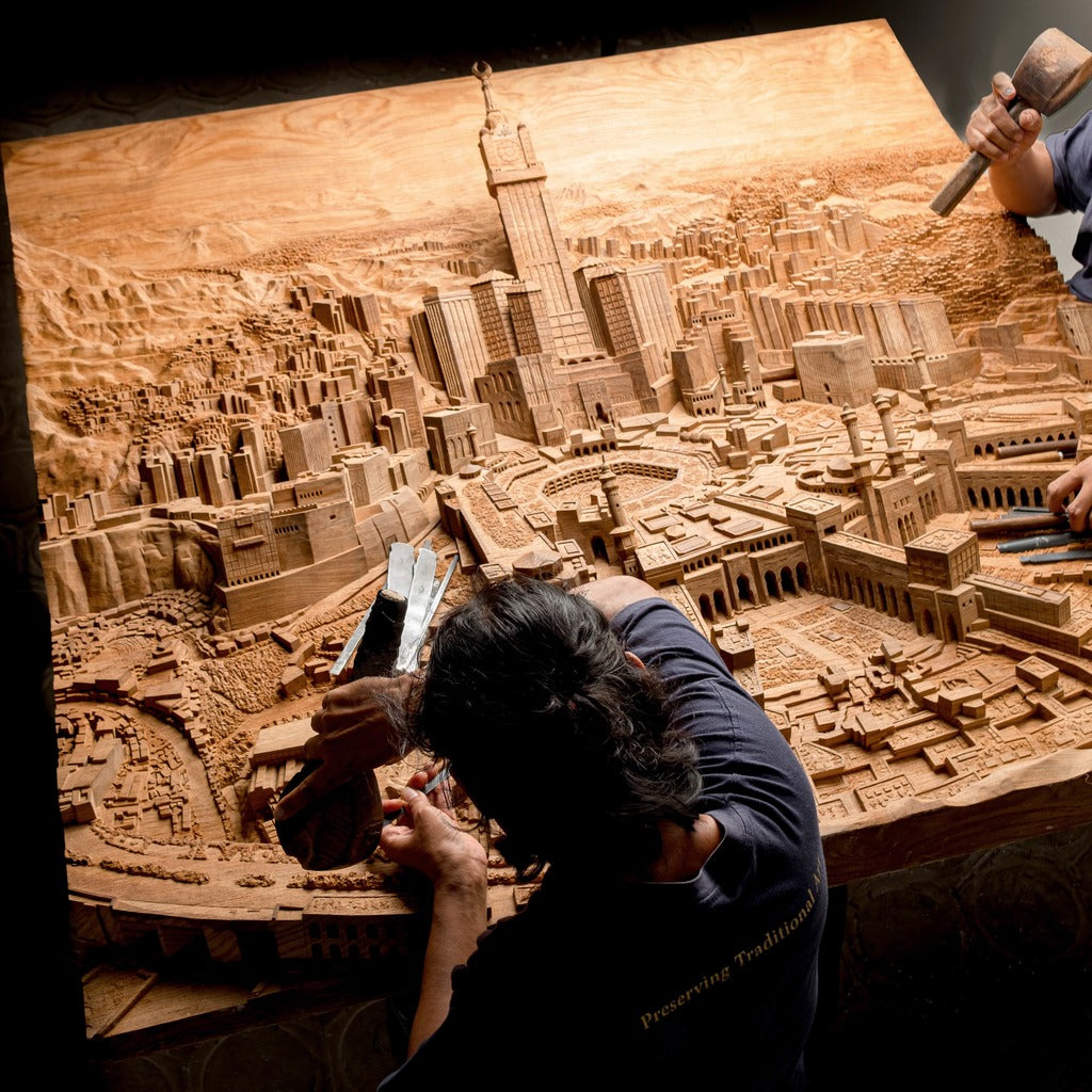 See moreThe Mecca, also referred to as Makkah al-Mukarramah and commonly shortened to Makkah. The 3 Dimensional carving of Mecca is produced on a solid teak wood. The making of this masterpiece requires the collaboration of various artists across multiple trades.