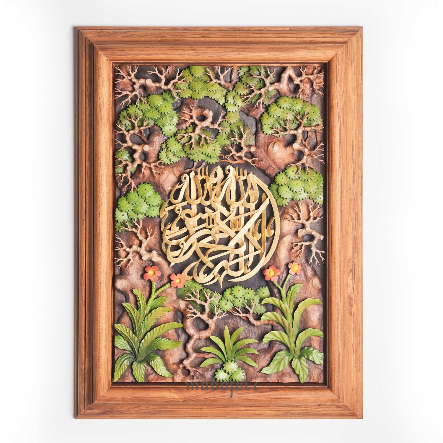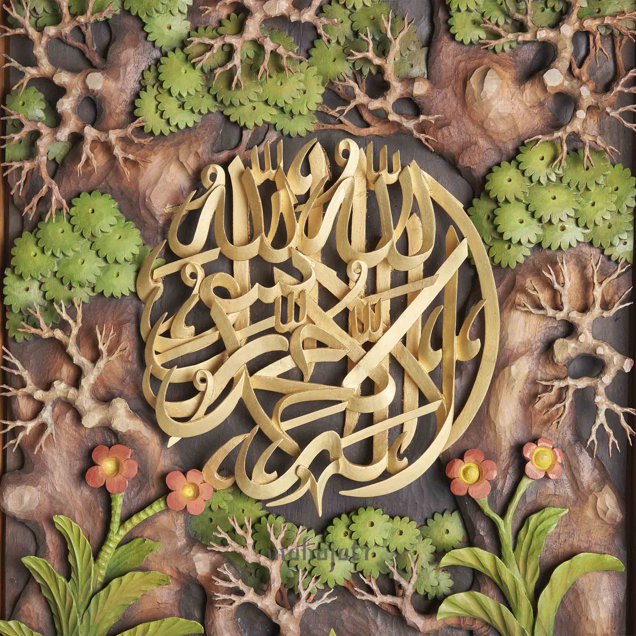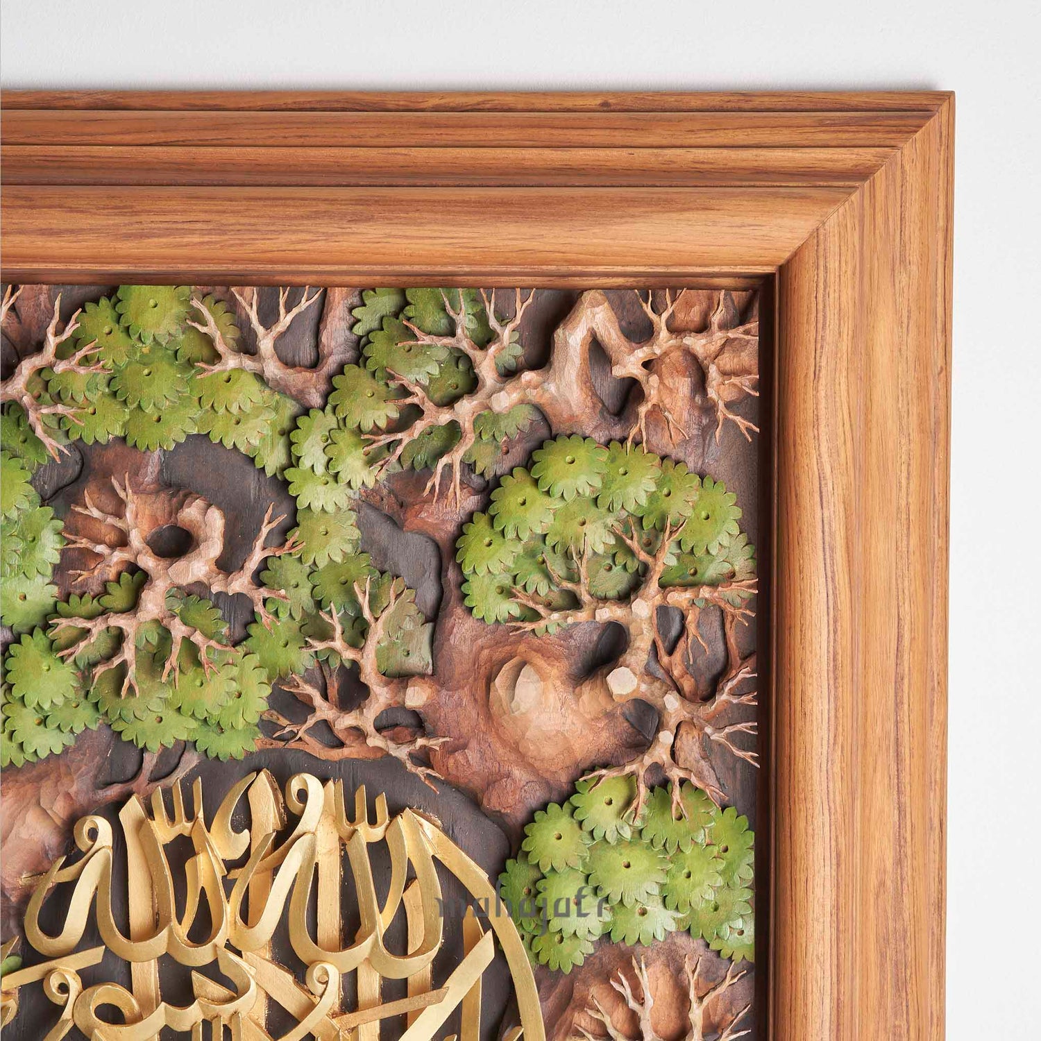 Measuring 75cm (length) by 100cm (height), the hand-carved 3 dimensional wood art of La Ilaha Illallah takes five months to complete and includes a modern walnut finished frame.