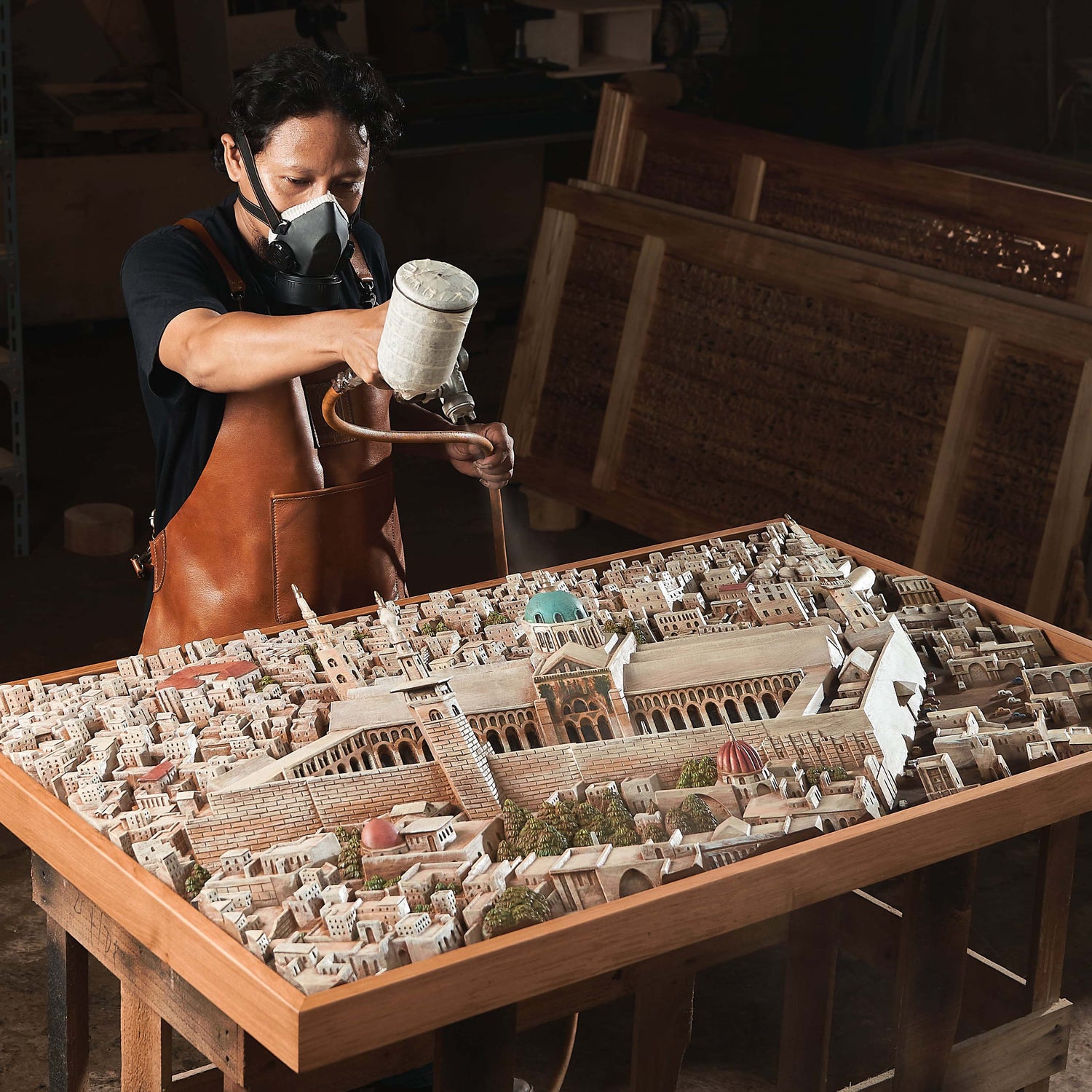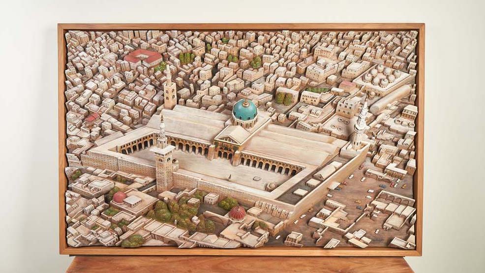 Drawing on elements of Islam in life, this three-dimensional hand carving of the The Umayyad Mosque skyline is intended to portray the beauty in humanity, harmony, and community that Islam values highly.