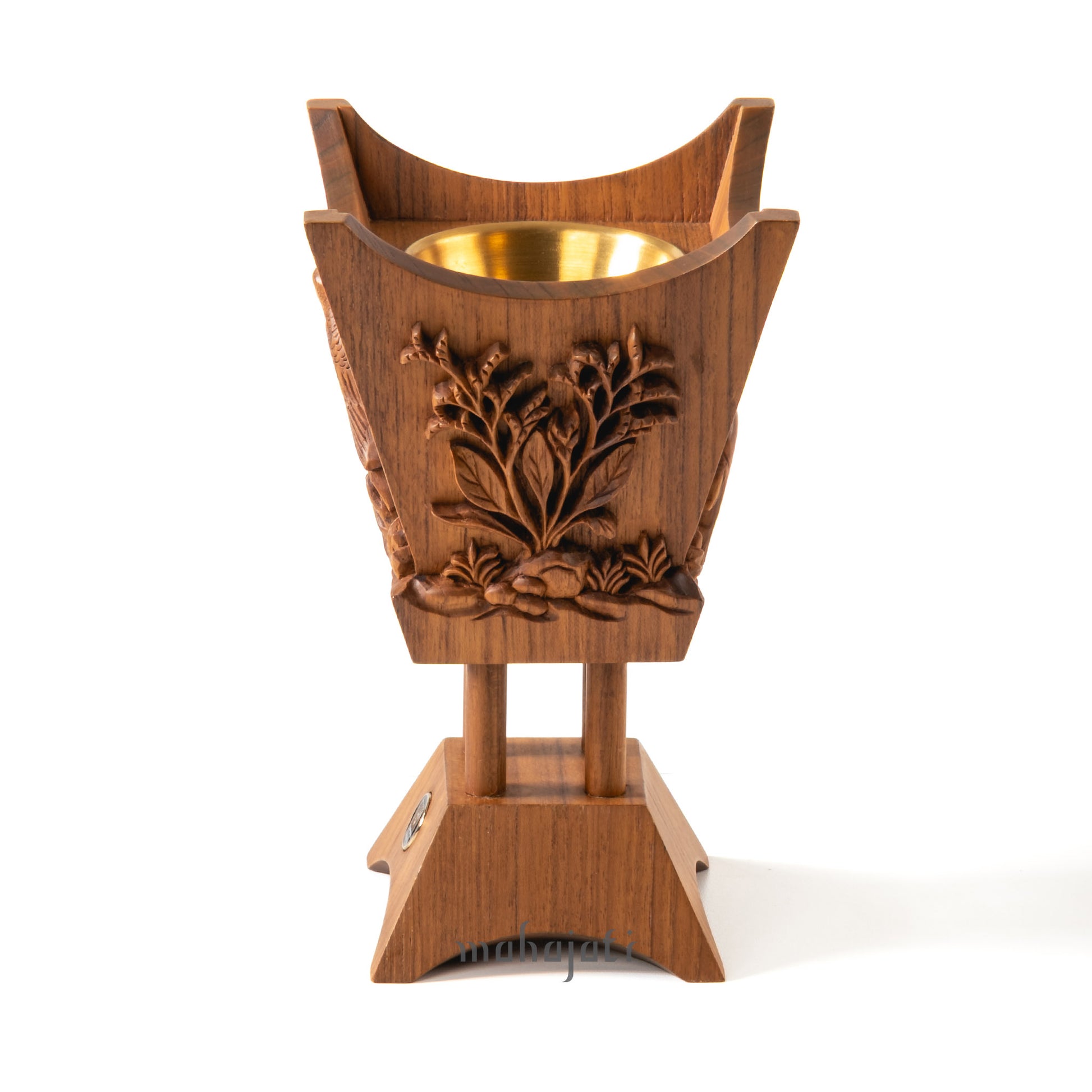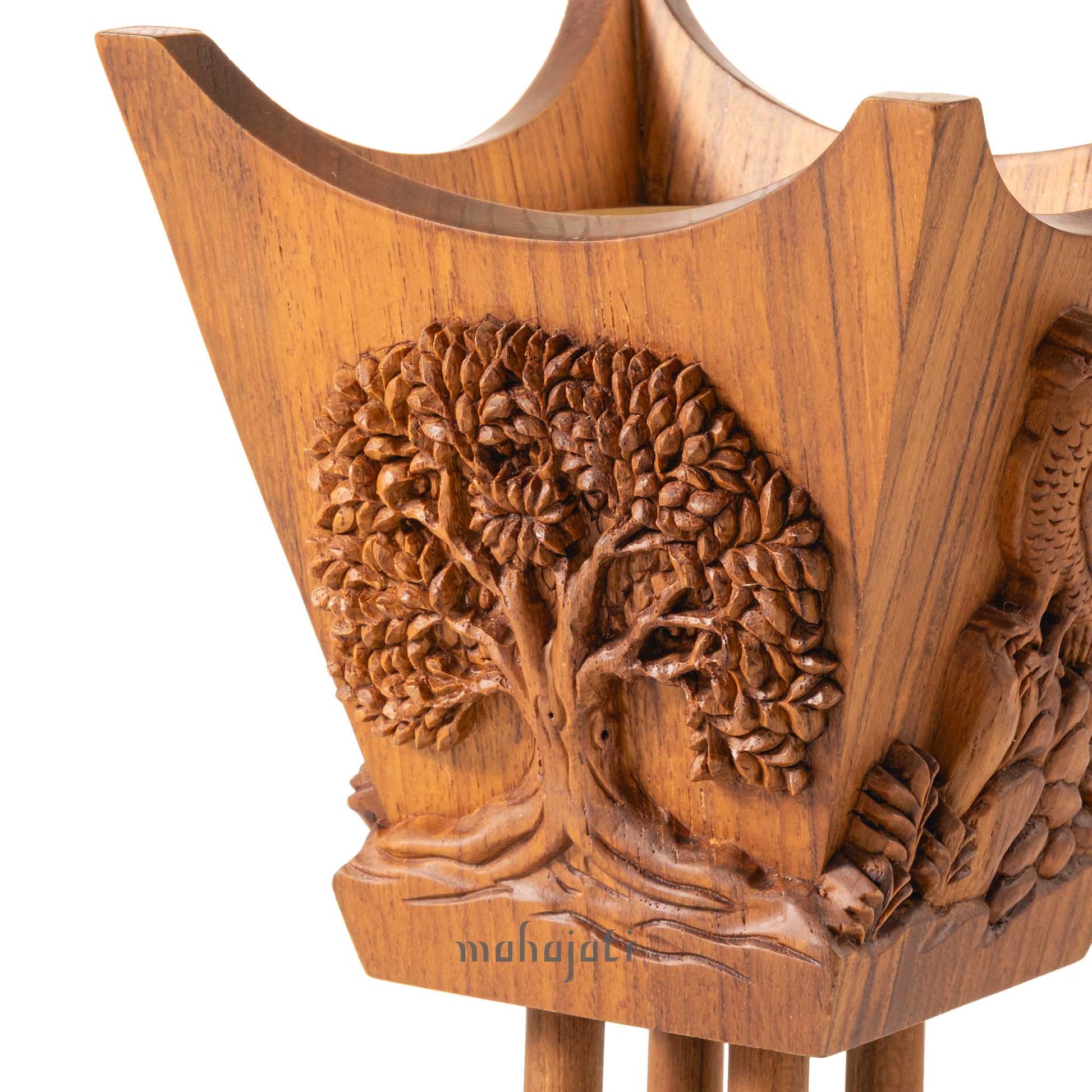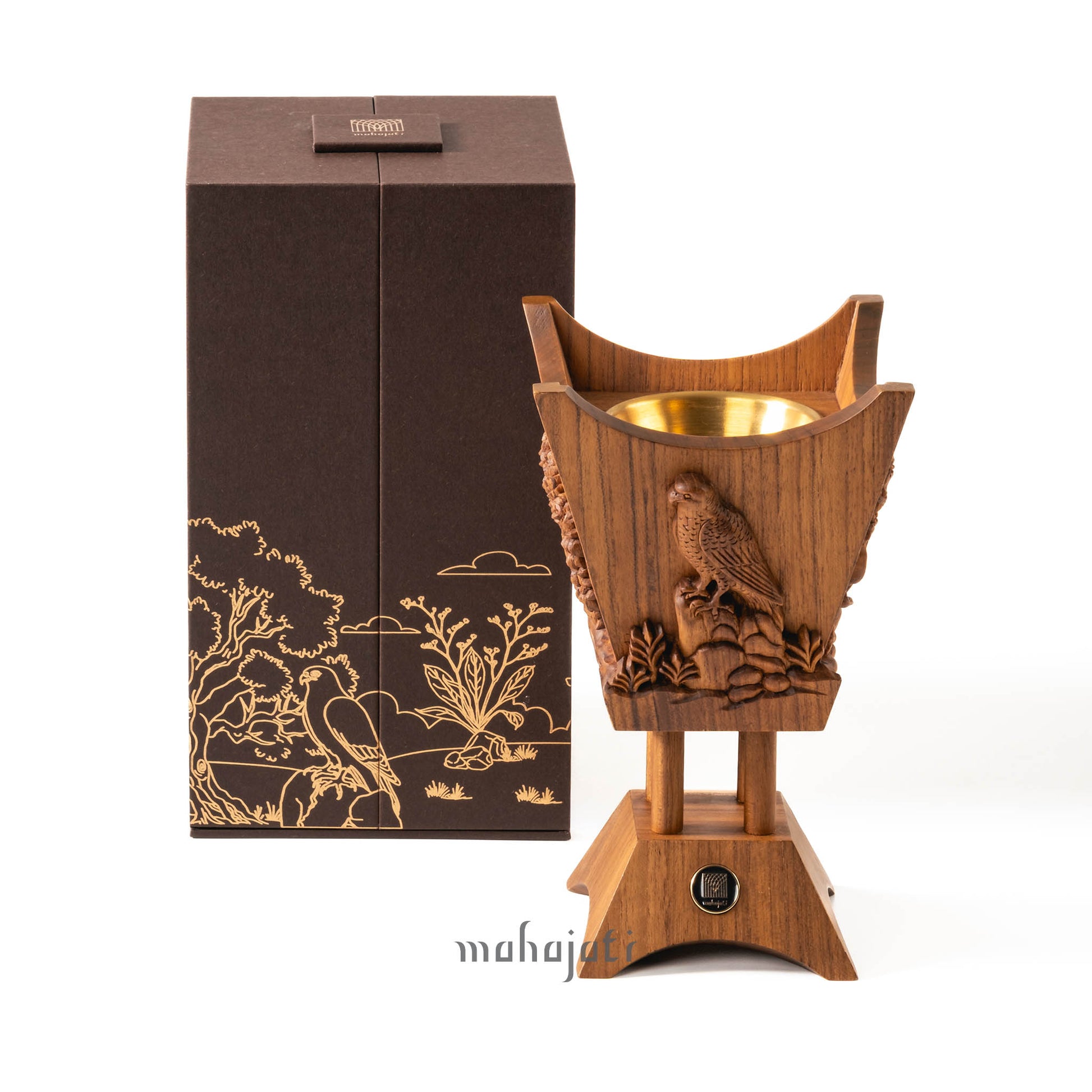 Inspired by traditional Arabian incense burners, this hand-carved teak wood mabkhara celebrates the region’s rich heritage. Each of its four sides features symbolic carvings — the Falcon, Sidr Tree, Arabian Oryx, and Qataf Flower — representing courage, endurance, and natural beauty. With its timeless classic form and intricate craftsmanship, it embodies the spirit of Arabia and the enduring art of tradition.