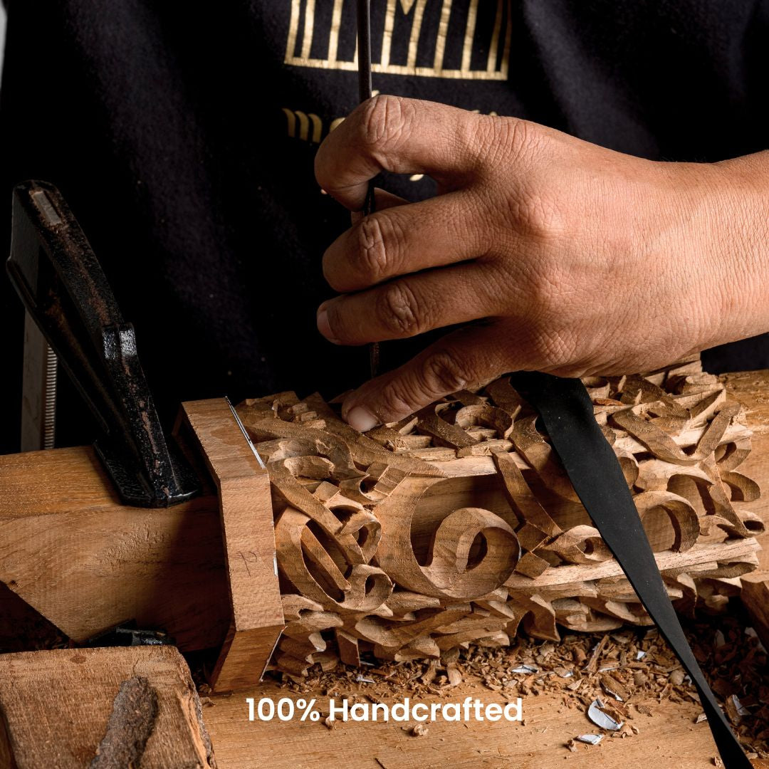 A beautiful and one-of-a-kind Islamic teak wooden Mubkhar engraved with the calligraphy of Surah Al-Ikhlas / Surah Al-Falaq / Surah An-Nas.