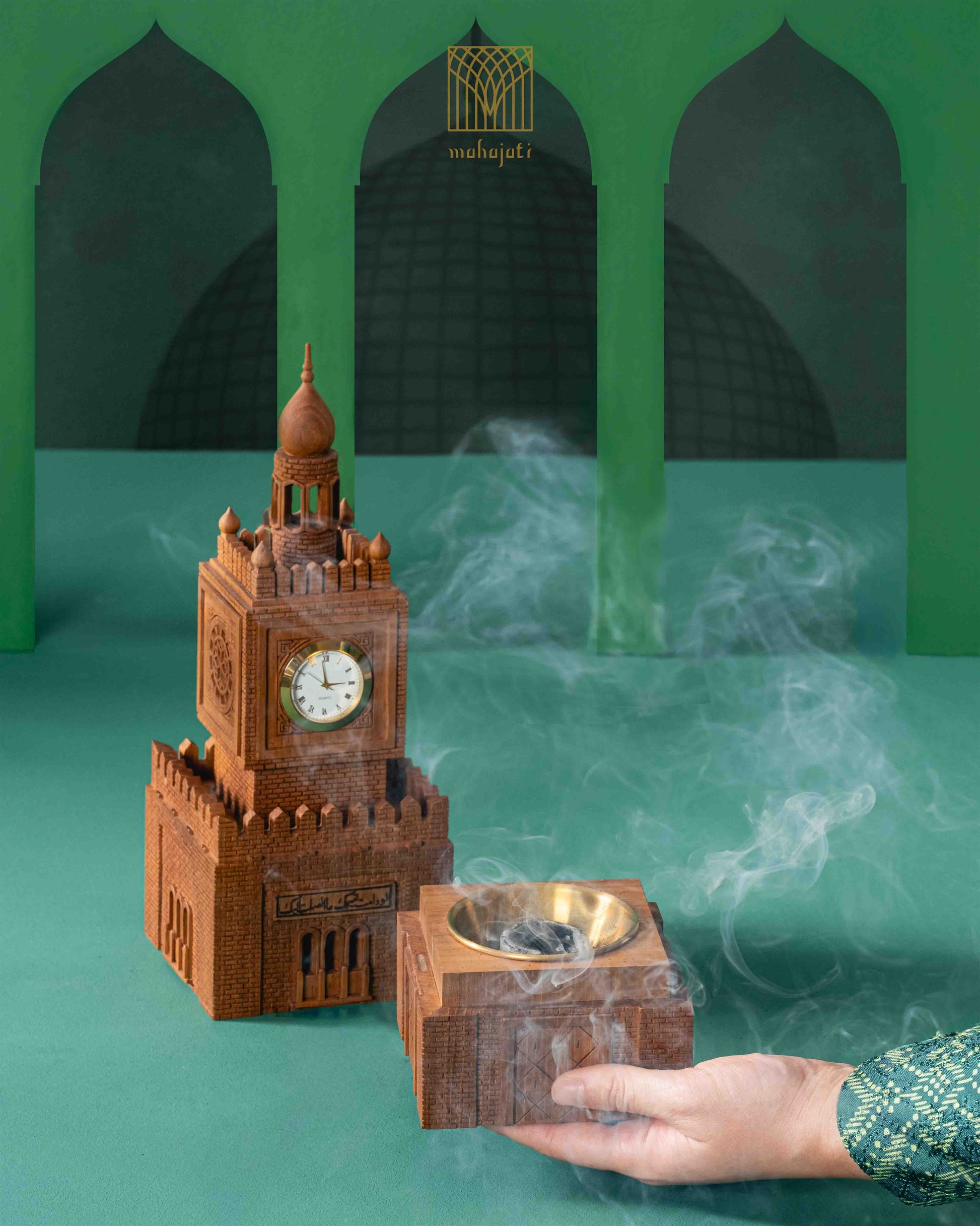 Seif Palace Mabkhara with Clock is a dual-function piece, hand-carved from high-grade teak wood by Mahajati artisans using the traditional chip-carving technique. Inspired by the iconic Seif Palace clock tower in Kuwait, the upper tower features a working clock, while the base serves as a Mabkhara for burning bakhoor. Designed as one architectural form, it brings together time and ritual, reflecting Kuwait’s heritage through enduring craftsmanship and thoughtful detail.